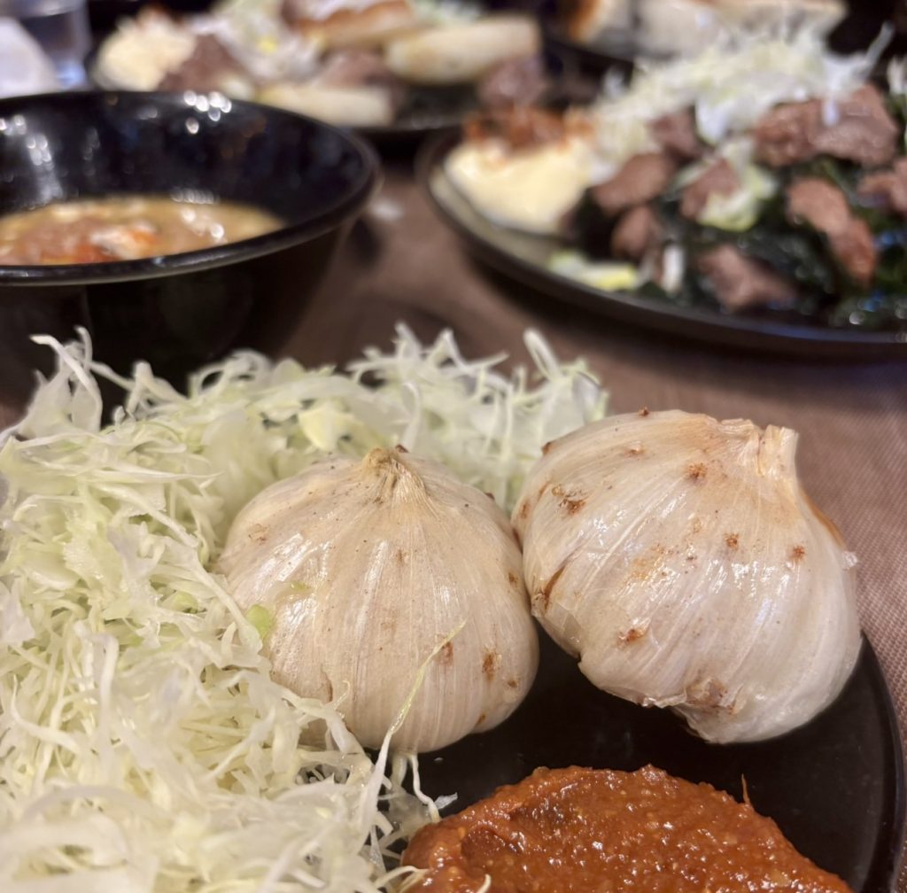 チャーシューエッグ、こめかみわかめ、ニンニクの丸揚げなどを注文。