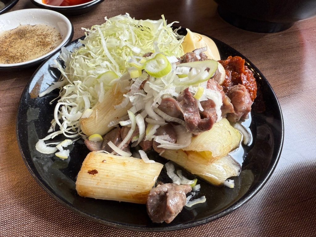 太いネギと大きな砂肝を辛味噌とマヨネーズでいただきます!