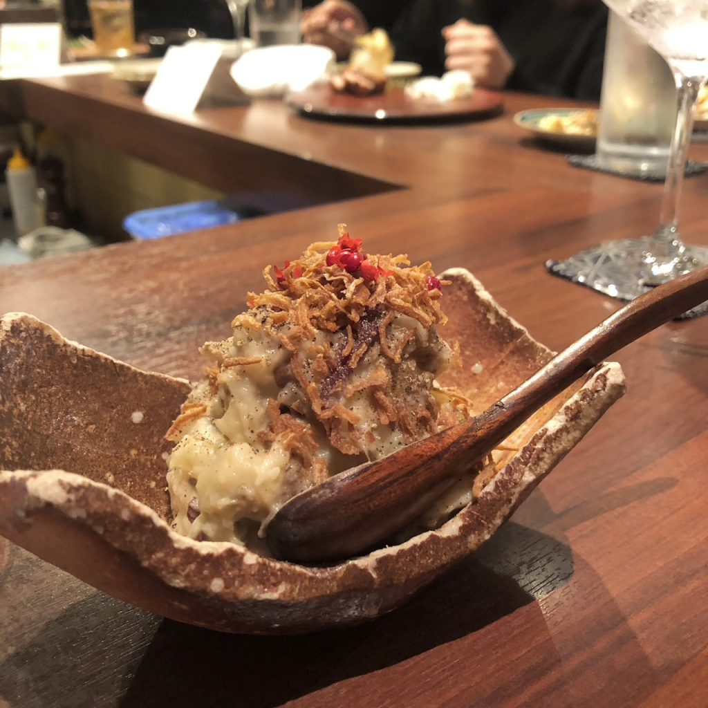 大人のポテサラはいぶりがっこが入っており、燻製の香りとポテトサラダの風味がマッチしておつまみに最高です♪上に乗っているピンクペッパーもアクセントになり、食べ終わるまでに一つのお料理で様々な味が楽しめました。