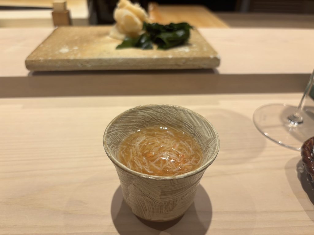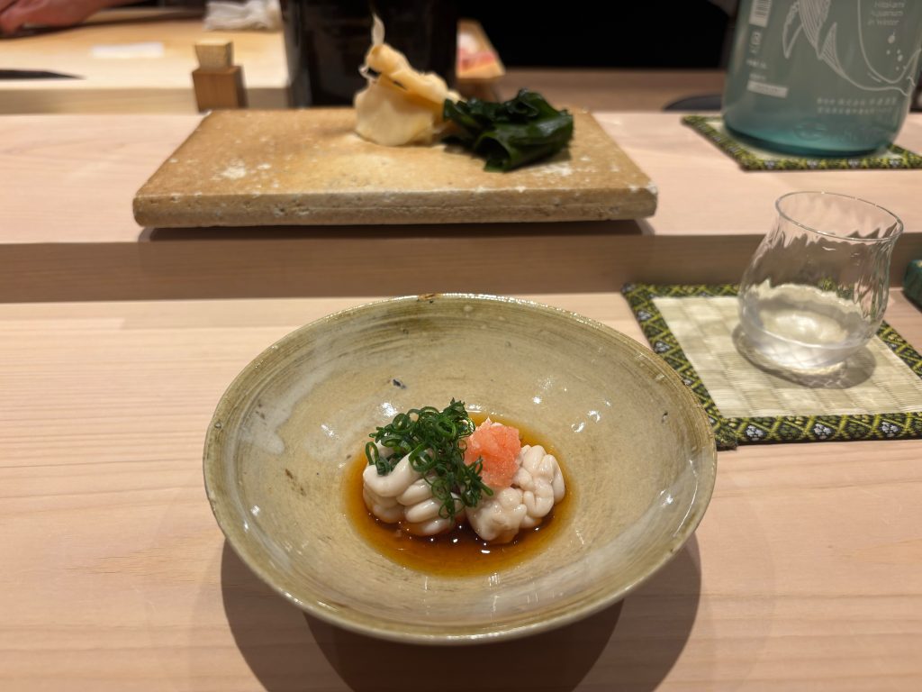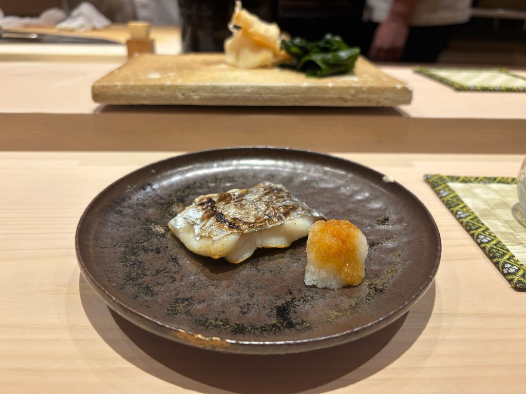 ズワイガニの茶碗蒸しから始まり、お刺身や白子、焼き魚とお寿司の前にたくさんのおつまみが出てきました。