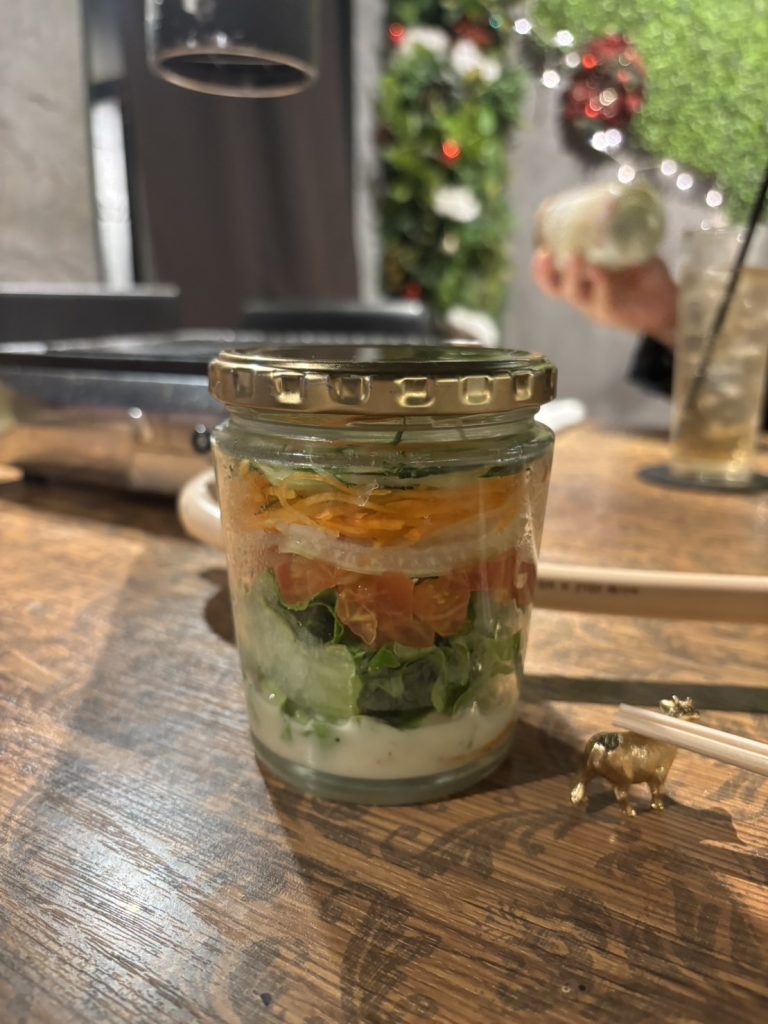シェフのオリジナルサラダはビンに入っていてなかなか珍しいサラダでドレッシングが今までに食べたことのないお味でクリーミーで美味しかったです!